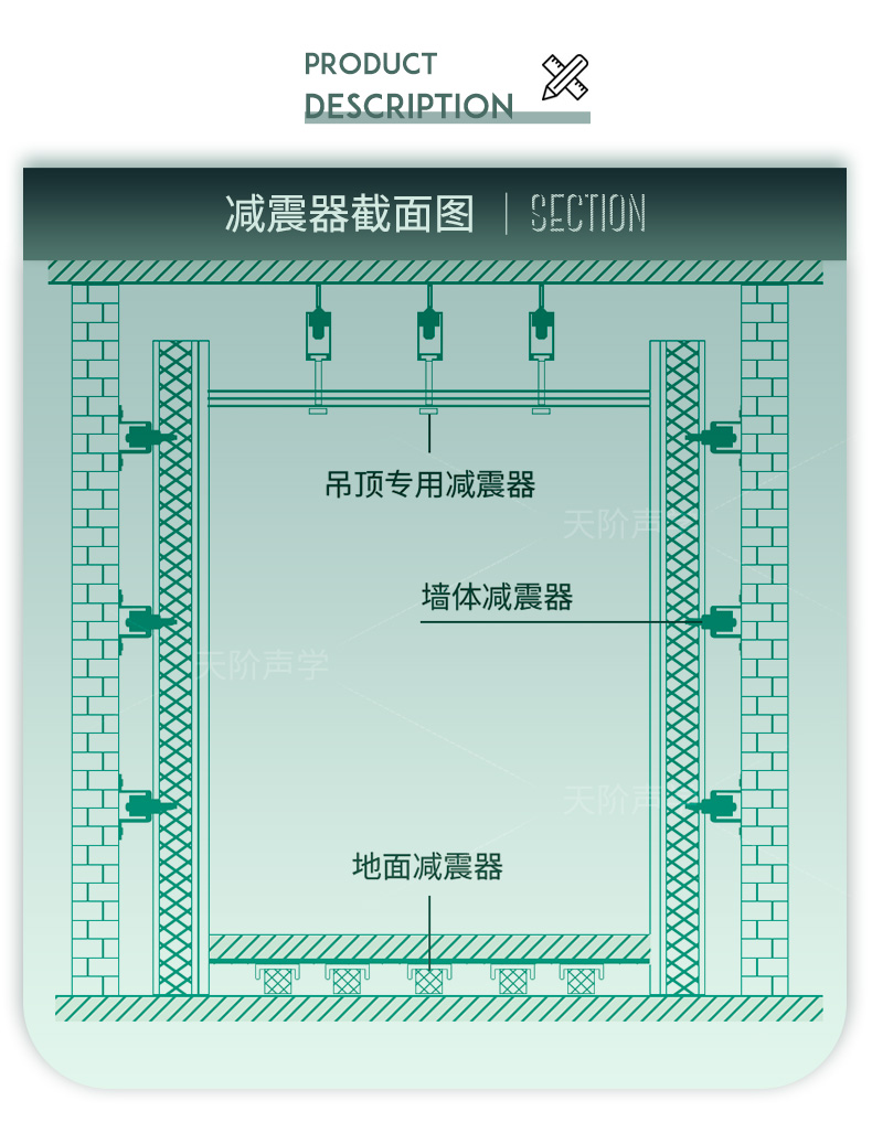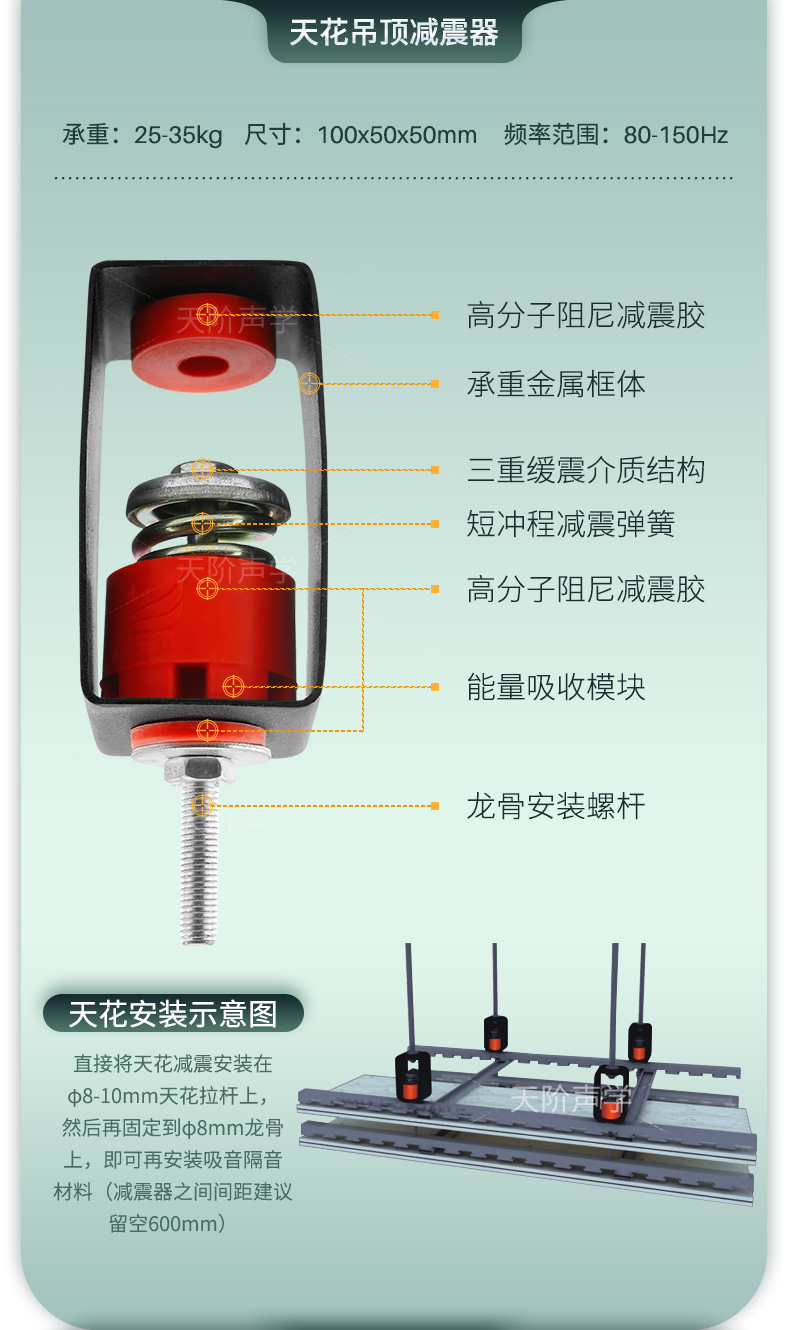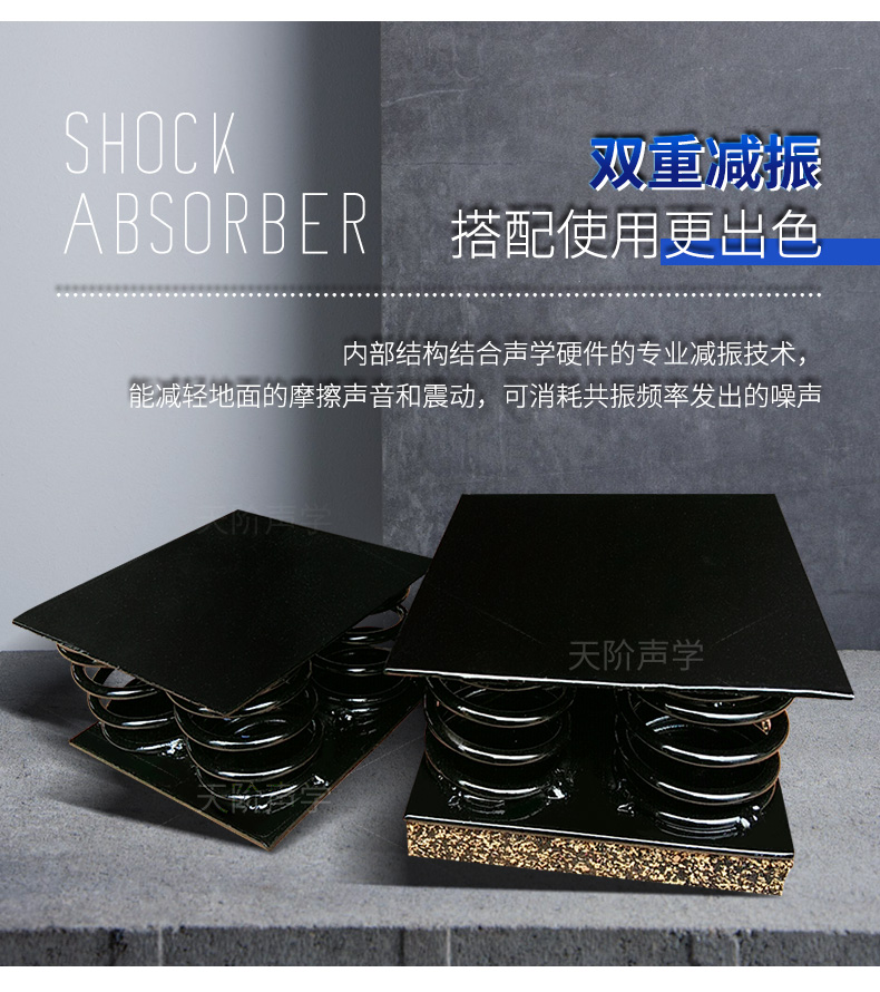 天花墻體隔音減震器是用于天花墻體隔音的必要構件。它特有的阻尼橡膠塊可以切斷聲橋的傳播,尤其對KTV、酒吧里有低音炮的地方,這是重要的隔音系統配件,不然,無論多少隔材料都無法將聲音阻隔于包廂房內。