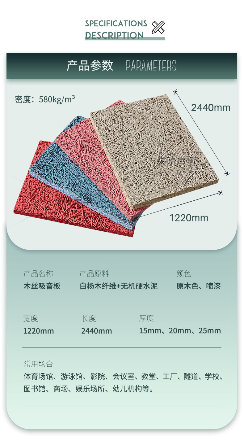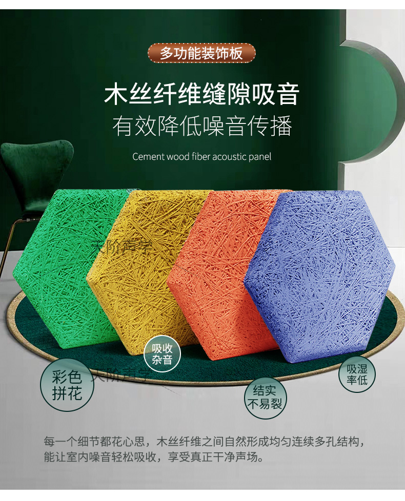 木絲吸音板的表面紋理表現(xiàn)出高雅質感與獨特品味,可充分演繹設計師的創(chuàng)意和理念。該產(chǎn)品結合了木材與水泥的優(yōu)點:如木材般質輕,如水泥般堅固,具有吸音、抗沖擊等多種功能,可廣泛應用于體育場館、劇場、影院、會議室、教堂、工廠、學校、圖書館、游泳館等處。