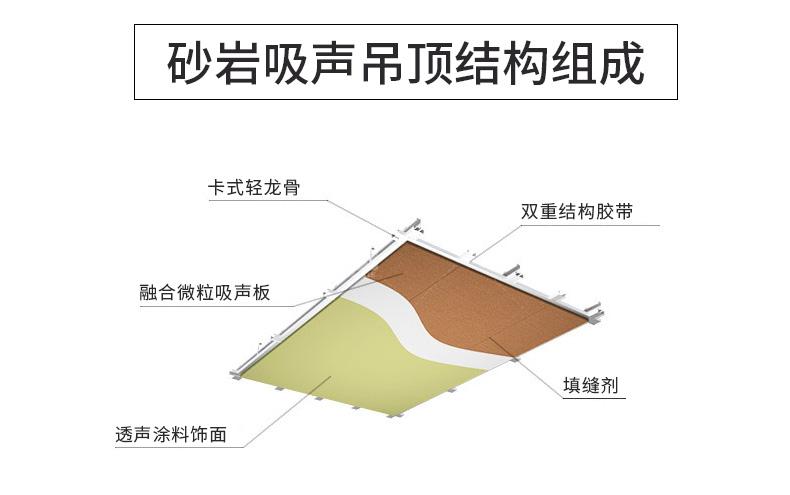 砂巖吸音板,它的基材有兩種,一種是具有吸聲防火**的強化玻纖板為基材,這種基材為大家所熟知,也是很多設計師慣用的一種高端吸聲材料;另外一種基材是由特定直徑的輕質砂粒為原料,通過聚合技術使每個顆粒之間如焊接般聚合在一起,由于無機顆粒的表面不規則形狀或聚合空隙,微粒之間形成了大量不規則且互相連通的微觀孔隙結構。